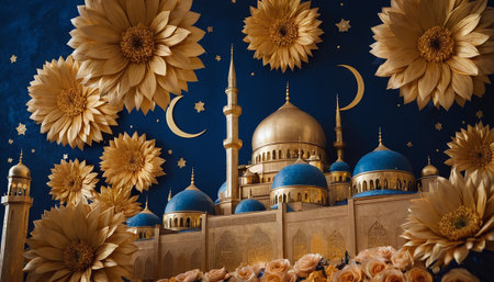 Crescent moon, mosque and flowers on blue background. Ramadan Kareem
