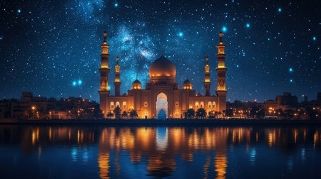 Night view of the mosque with beautiful milky islamic nuances background