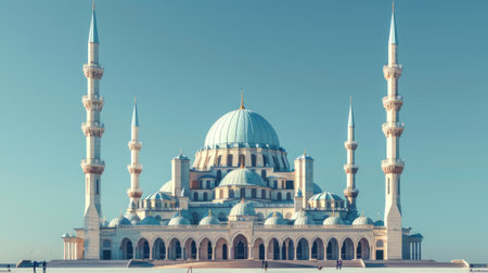 An illustration of a grand mosque with intricate details and golden domes, set against a twilight sky.