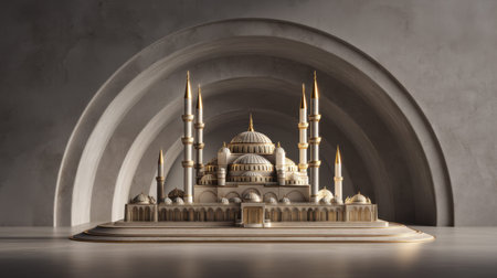 This stunning architectural model showcases a historic mosque, highlighted by golden domes and elegant minarets, set in a minimalist environment.