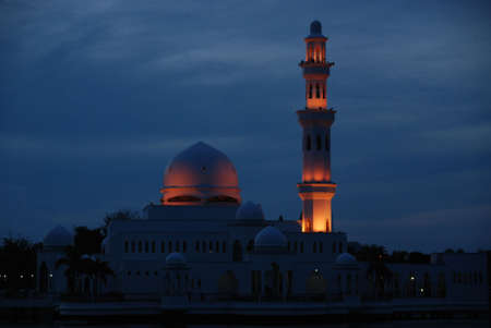Banner Beautiful white islamic mosque with blue roof sunset cloud with sun light