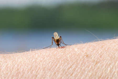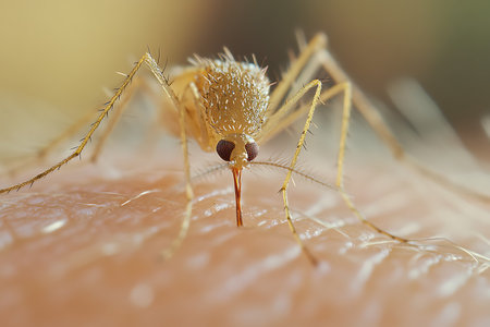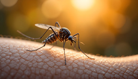 Mosquito feeding on human skin, with a focus on the insects details.