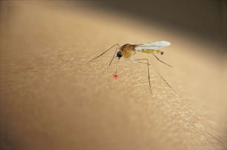 Mosquito with a syringe injection mouth drawing blood from a human skin.