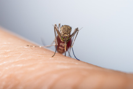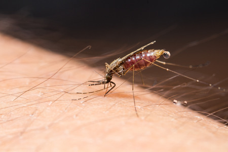 Photo of a close-up of a mosquito sitting on skin, disease carrier of malaria, insects