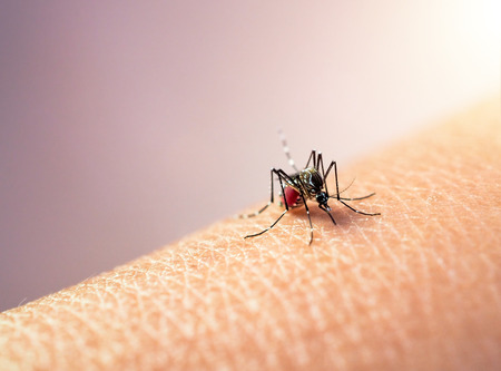 Macro of mosquito (Aedes aegypti) sucking blood close up on the human skin. Mosquito is carrier of Malaria, Encephalitis, Dengue and Zika virus