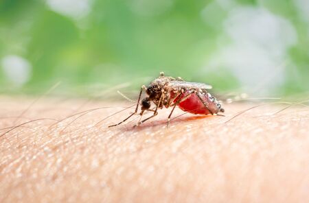 Mosquito sucking blood on human skin with nature background