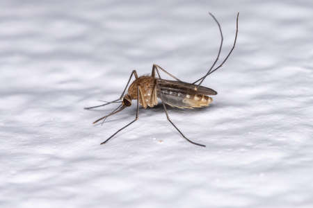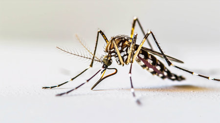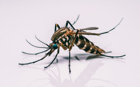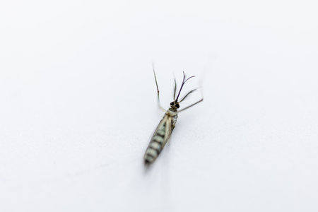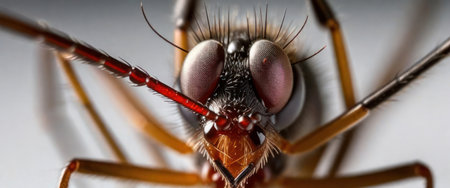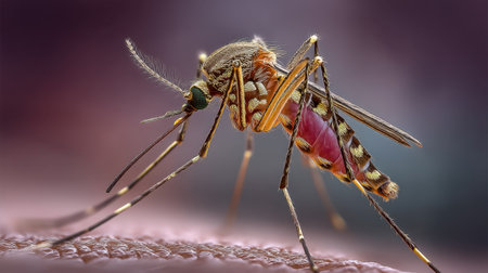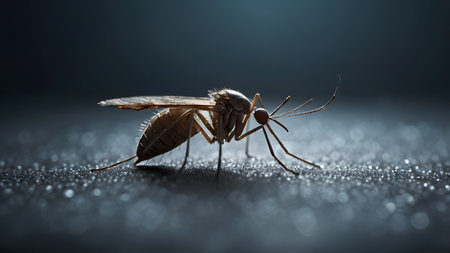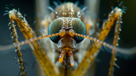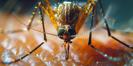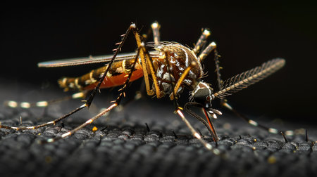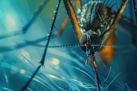 Macro shot of a mosquito, detailed with fine hairs and glistening droplets