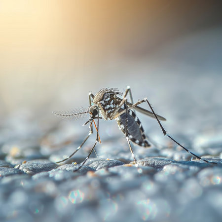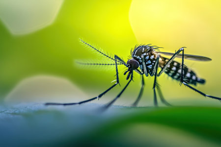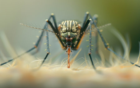 mosquitoes can be a serious problem in tropical regions. this photo captures the essence of this issue with its vibrant use of light and shadow, delicate modeling, and striped pattern. the light gold and green hues of the image, captured with the sony fe 12-24mm f28 gm lens, create a sense of warmth and urgency. the light brown and silver tones add depth and texture
