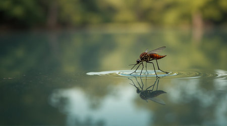 Focused mosquito perched on surface of water creating ripples with reflection in nature outdoors
