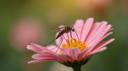 Mosquito rests on vibrant pink daisy flower, a macro shot showcasing nature's delicate balance and beauty