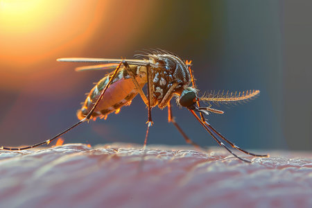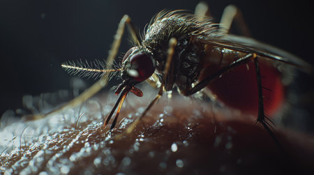 A detailed close-up view of a mosquito feeding on human skin, showcasing the intricate features of the insect. Perfect for nature and biology studies.