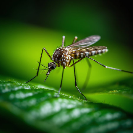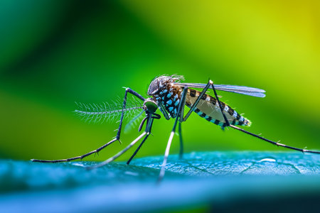 Macro shot of a mosquito on a green leaf, showing its detailed features.