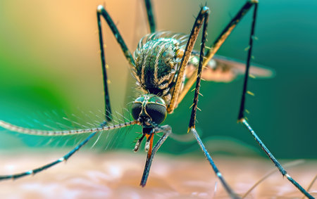 Macro close-up of a mosquito with blurred green background, highlighting insect detail, nature, and bite concern.