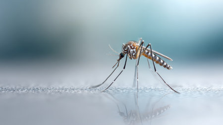Mosquito standing on a reflective surface with its reflection visible, creating a visually appealing contrast against a soft, blurred background