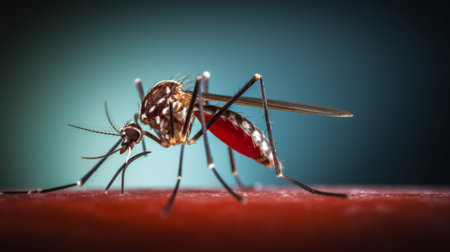 Aedes aegypti mosquito biting/sucking into human skin, soft focus blue tone filtered for medical background. The dengue virus and the zika virus are carried and spread by mosquitoes in the genus Aedes