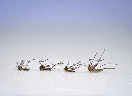 Many dead mosquitoes on white background