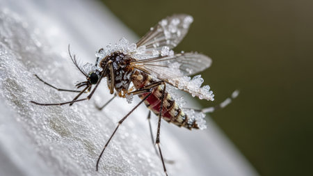 A detailed image showcases a mosquito, with delicate crystal structures adorning its wings. The composition emphasizes texture and detail, focusing on the insect's body and appendages. The background is blurred, suggesting an outdoor environment, with natural lighting. This image is suitable for educational materials or editorial publications.
