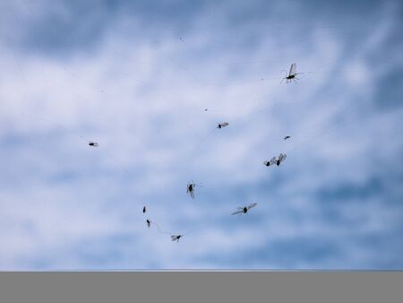 A flock of mosquitoes flies in the sky. Mosquitoes close-up. Flying insects. Insects are dancing