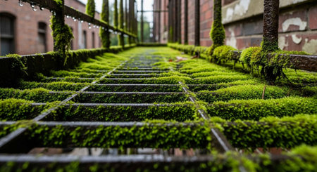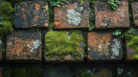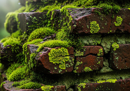Lush green moss and bright lichen thrive on the weathered surface of a dark red brick wall, showcasing natural growth and decay.