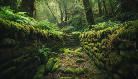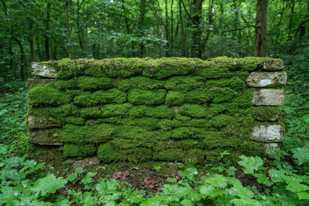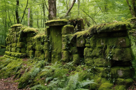 moss-covered dry stone wall surrounded by greenery, created with generative ai