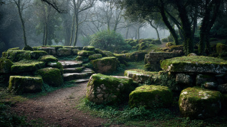 Ancient stones covered in moss stand quietly in a misty scene, surrounded by trees and soft natural light, evoking a sense of history.