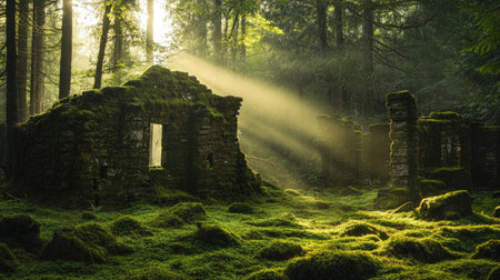 A captivating scene of sunlight piercing through the trees, illuminating ancient ruins overgrown with moss. This tranquil forest landscape evokes a sense of mystery and harmony.
