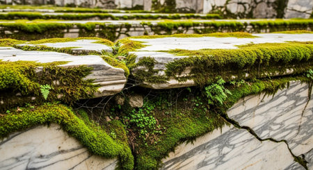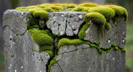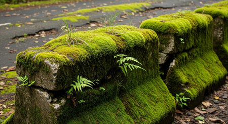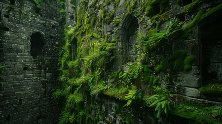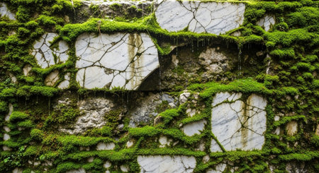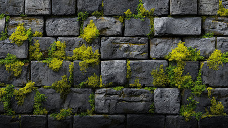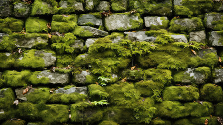 A striking stone wall adorned with vibrant green moss and lichen, combining natural elements with architectural strength. Ideal for nature and design themes.