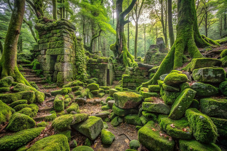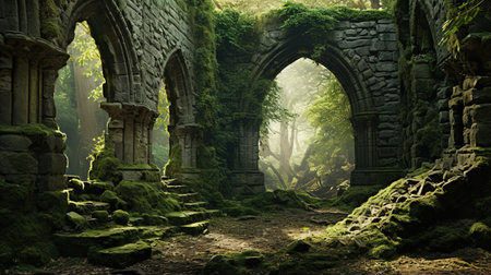 Explore the serene beauty of abandoned stone ruins enveloped by lush greenery and gentle lighting, evoking a sense of history and mystery.