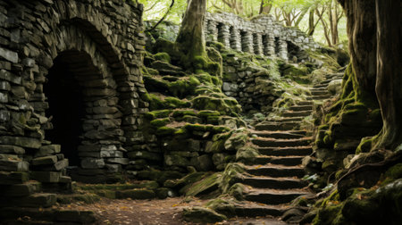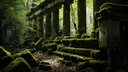 Enchanting, moss-covered stone ruins peek from a secluded forest, showcasing the quiet grandeur of nature reclaiming lost structures, in stunning detail --chaos 30 --ar 16:9 --v 6.1 Job ID: c3e6ea0c-74d4-4fba-9bbb-3c9ccb283fd0