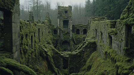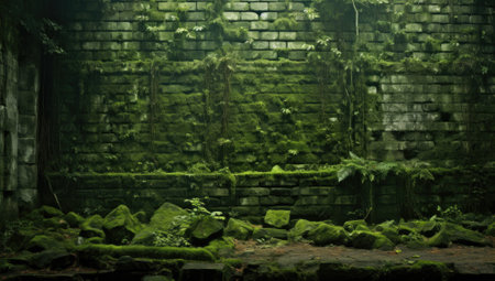 Generative AI, Old green ruins of historical building overgrown by moss and grass