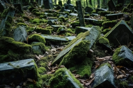 gravestones in an overgrown cemetery with a crumbling stone wall, created with generative ai