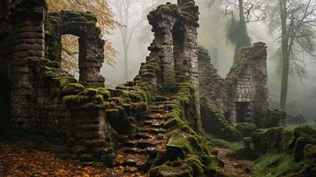 Ancient Ruins Covered in Lush Moss, Misty Forest