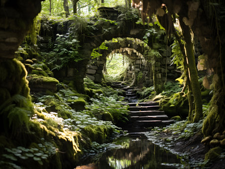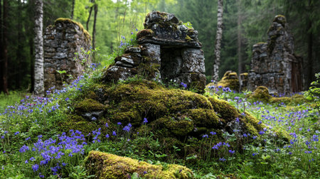 An enchanting scene of an abandoned stone structure consumed by vibrant greenery. This peaceful setting evokes a sense of mystery and tranquility, perfect for exploration themes.