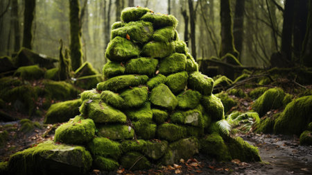 AI Generated. Moss covered stone structure with carved designs on the surface