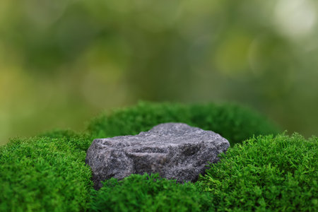 empty large stone as stand with green moss on natural background. Mockup for cosmetics and other products display