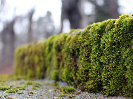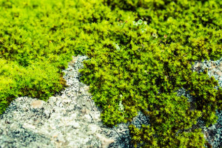 Moss grows on a mantel in the park. Bright green lichen. natural texture.