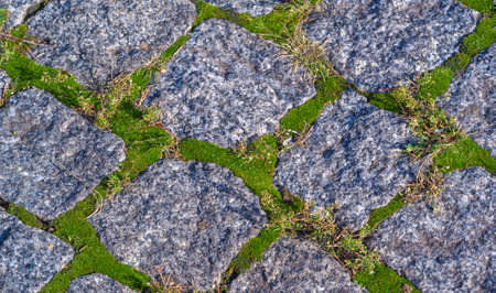 Old cobblestones covered with moss with sprouts sprouting through. Selective focus macro shot with shallow DOF