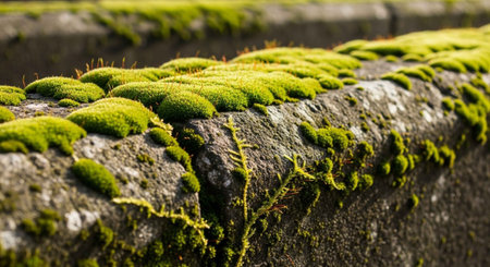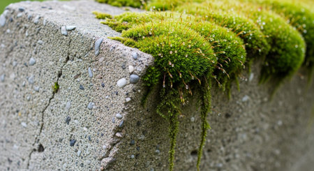 Green moss grows on the right surface. Moss grows on wet areas. Green thallophytic plant.