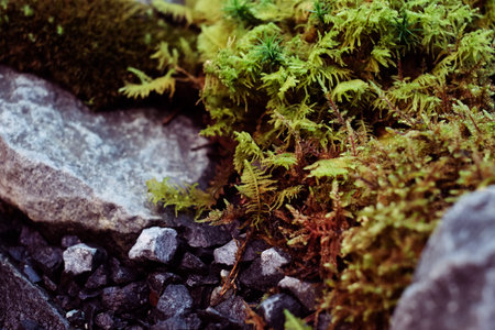 Natural textured background with bright green moss and pebble stones with copy space, wallpaper, beauty in nature