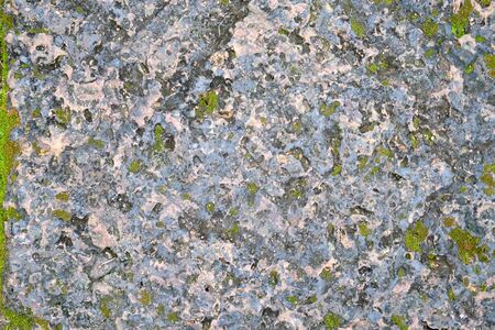 Old gray stone wall with green moss texture background. Closeup, macro photography