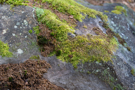 close up of sandstone rocks covered with green moss and lichens during fall season