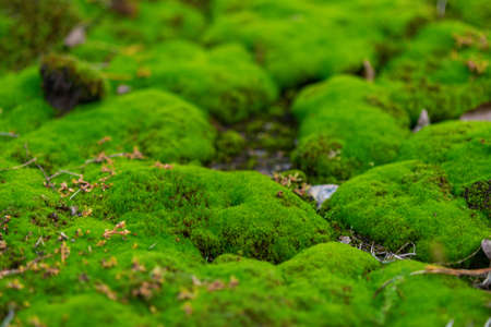 Green moss on the forest floor in the morning. Shallow depth of field.