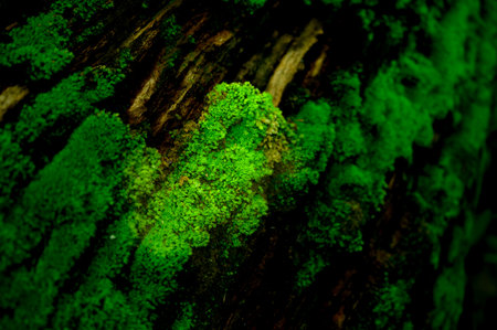 Green moss on the bark of tree in the forest. Close-up photo with bokeh.