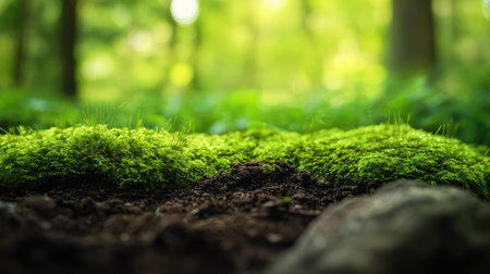 Macro shot of bright green moss on damp soil and stones in a dense forest, with blurred background for depth