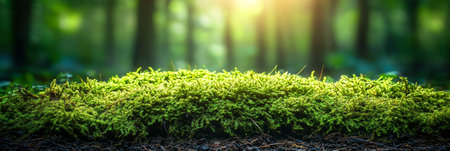 Green moss in the forest with bokeh background and copy space