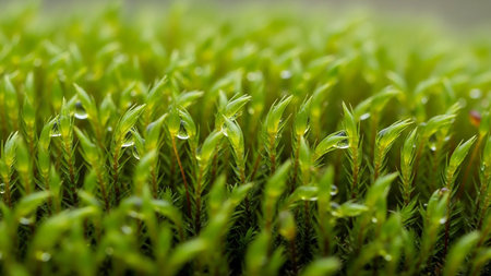 A detailed macro shot of vibrant green moss covered in tiny water droplets. Clear details and vibrant colors e...