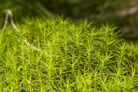 Selective focus green sprigs of club moss growing on the forest floor. Blurred background. Abstract light spots.