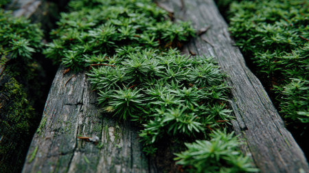 Lush green moss covers old, weathered wooden planks, showcasing nature's resilience.