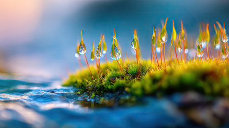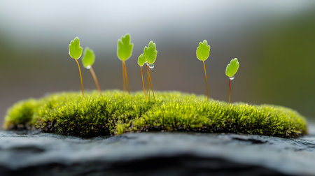 Delicate green sprouts emerge from a vibrant mossy surface, glistening with dew drops. The scene evokes a sense of new beginnings and natural beauty.