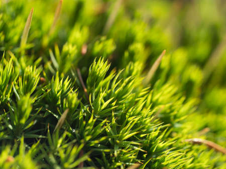 Close up, macro of Polytrichum commune green leaves, haircap moss in sunlight. Seasonal nature background with bokeh and short depth of field. Close-up with space for text.